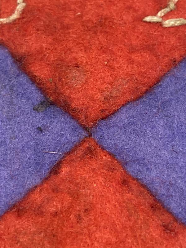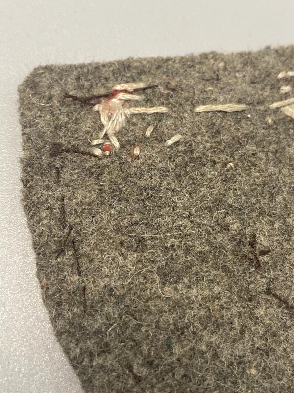 INCREDIBLE and EXTREMELY RARE original WWII Don Cossacks Volunteer Sleeve Shield, a field-made example crafted from coloured wool and sewn onto field-grey backing. This pre-1944 handmade variant predates the later printed “2nd Pattern” issue. Worn by members of the XV (15th) SS Cossack Cavalry Corps, these shields were produced locally in occupied territories and display distinctive irregular stitching and rustic construction.