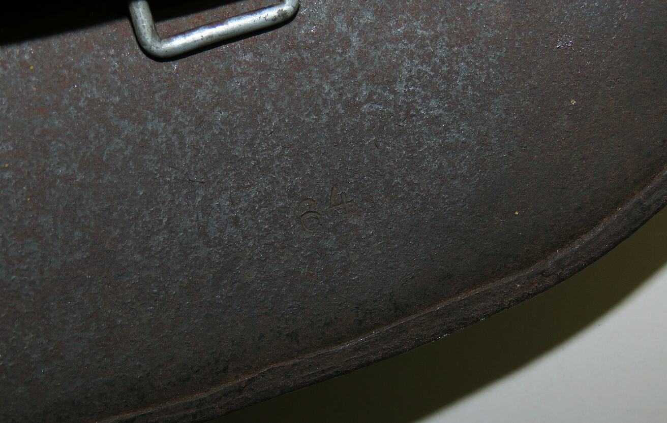 Shell is stamped “64” on the right apron. Overall condition is excellent for a combat-used, multi-period reissued helmet.