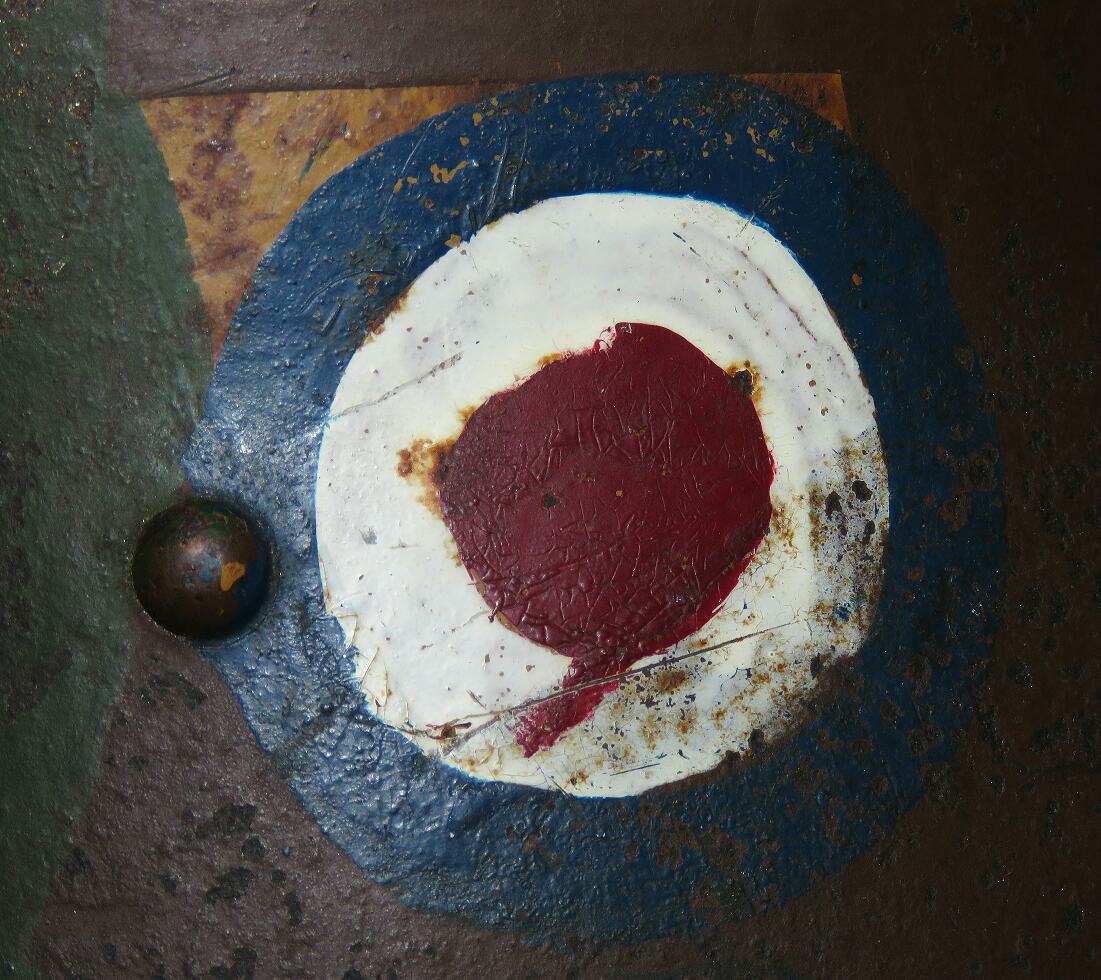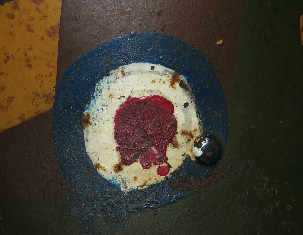 The Wehrmacht decal remains faintly visible beneath the left removed horn position, partially covered by camouflage paint and located in an atypical position, supporting its re-issue history.