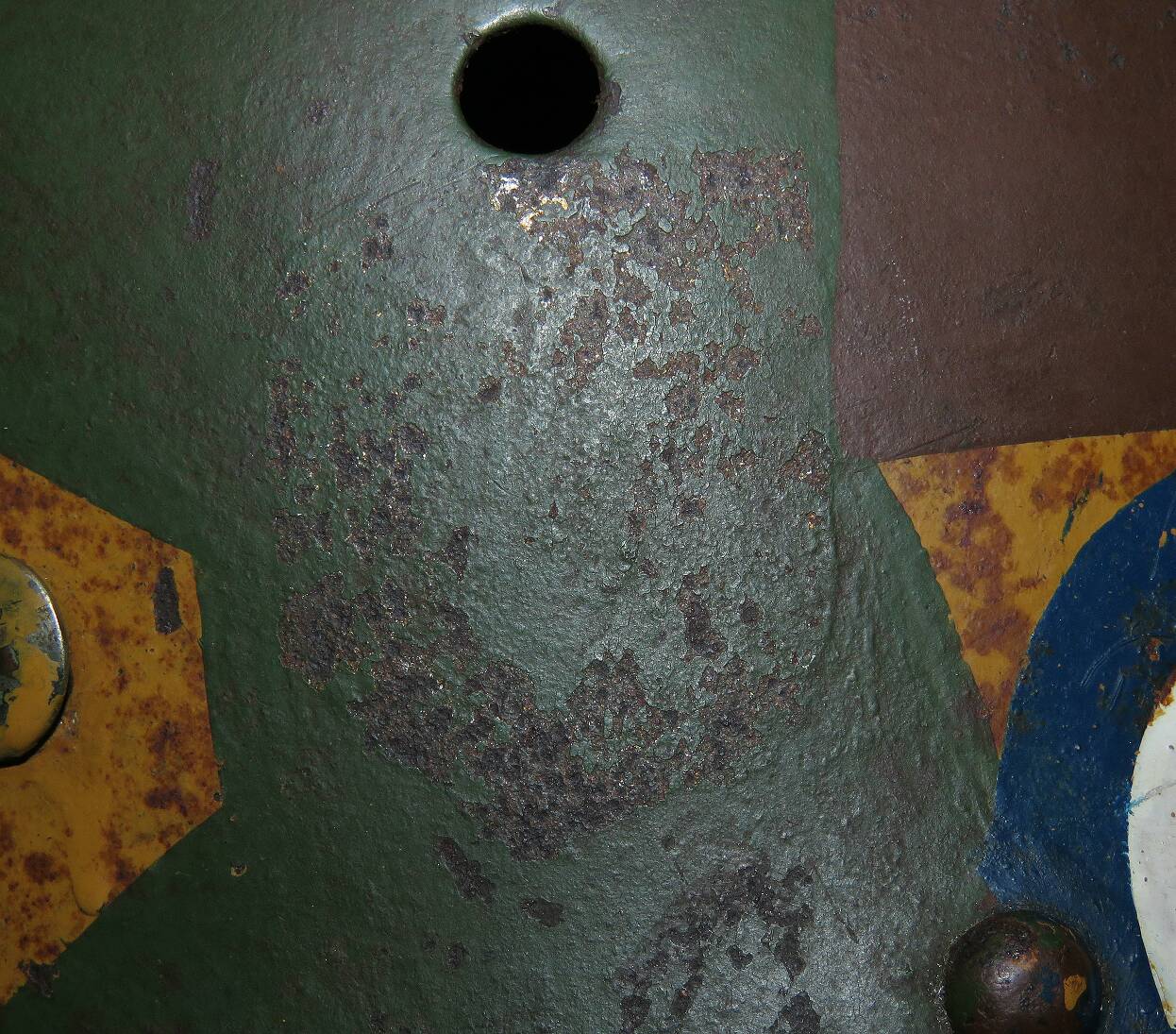 The helmet retains its early splinter camouflage with visible wear, oxidation, and field aging consistent with service use. Areas beneath the camouflage reveal earlier light green paint, visible particularly around rivets.