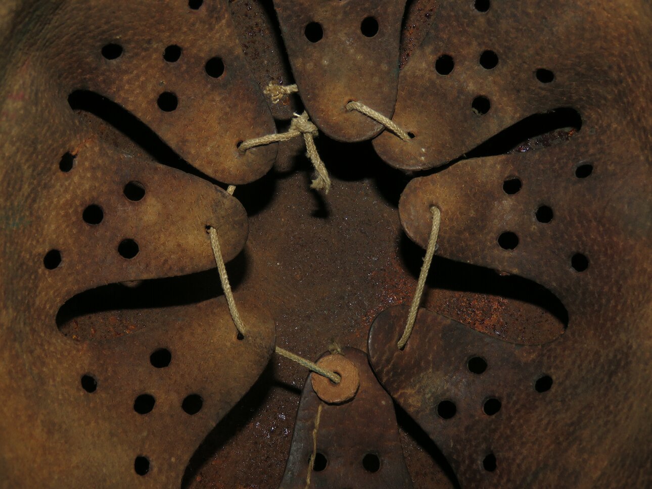 The armour plate lugs were professionally removed and the holes neatly sealed by rivets, consistent with factory or workshop modification. The chinstrap loop holes were similarly closed in a clean workshop manner.
