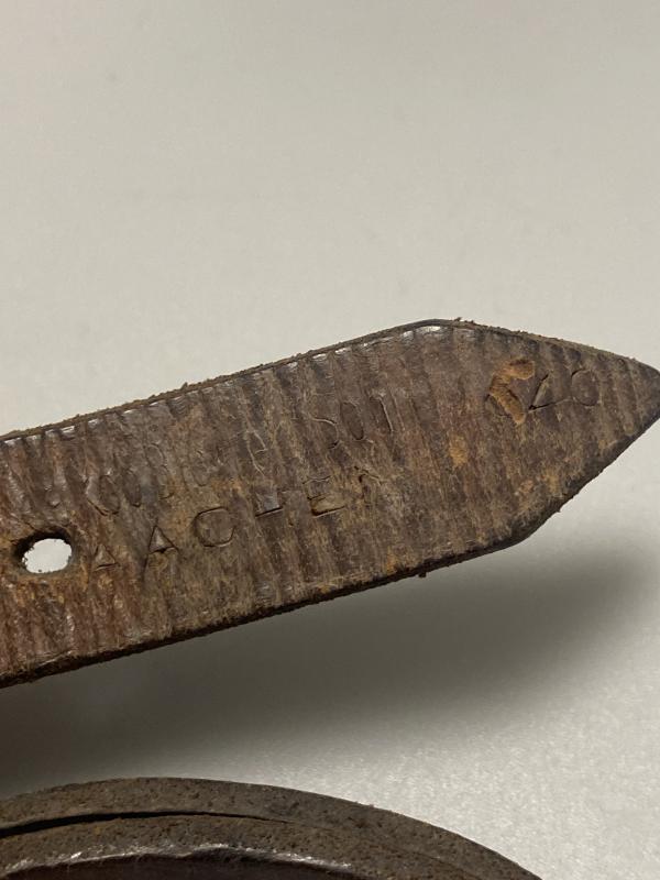 During the early stages of WWII, the German Army maintained high standards in leather production. Straps such as this were issued as multipurpose field gear, essential for securing the soldier’s Zeltbahn 31, canteen, or blanket roll. Production from Aachen—a key military supply city—reflects early-war precision before the later simplifications of wartime manufacturing.