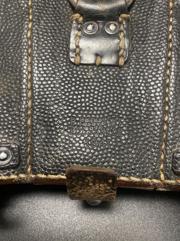 Issued to German infantrymen throughout the Second World War, these three-cell pouches held 60 rounds of 7.92×57 mm ammunition in five-round stripper clips. Early- to mid-war pouches such as this example typically exhibit high-quality leather and durable stitching. Production by R. Ehrhardt was common in 1941, supplying units across multiple Wehrmacht fronts during the expansion of the Eastern campaign.