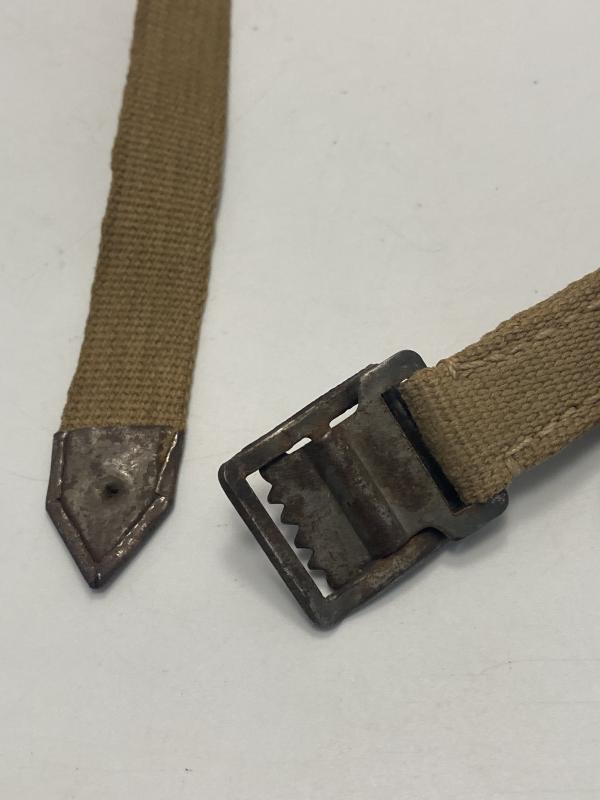 Original WW2 German Afrika Korps (DAK) tropical webbing equipment strap. Constructed from strong canvas with reinforced ends, metal buckle and leather retaining tab. A versatile field gear component used to secure equipment to packs, Y-straps and vehicles. An authentic piece of tropical theatre webbing in a desirable untouched condition.
