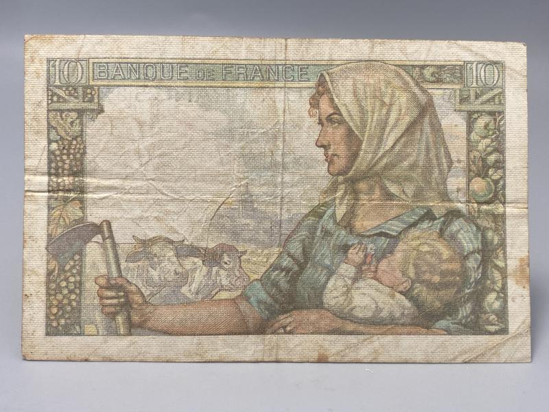Original Banque de France 10 Francs banknote, dated 1944, issued during the final phase of the Second World War. Designed in a rustic style, the obverse depicts a male labourer with a spade, symbolising the working strength of postwar France, while the reverse features a mother with child and scythe, representing renewal and agriculture.