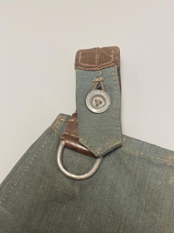 Original WWII German field police (Gendarmerie) bread bag in blue-grey canvas with brown leather reinforcements. This variant was issued to Ordnungspolizei units and differs from standard Wehrmacht field-grey examples. The belt hook has been removed, but all D-rings, leather tabs, and interior buttons remain intact. A solid, presentable example with no visible stamps.