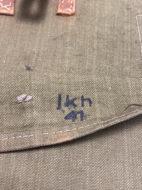 Original German Army A-frame assault pack (Beutel zum Sturmgepäck), constructed from durable olive-green canvas with reinforced stitching, leather tabs, and web straps. This field pack was designed to attach to the A-frame assembly and carry personal or combat essentials during short operations. Clearly maker-marked “jkh 41”, denoting manufacture in 1941 by a verified wartime contractor.