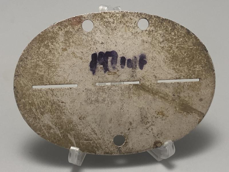 Original Wehrmacht Erkennungsmarke (ID disc) belonging to a soldier from 12. Kompanie, Infanterie-Regiment 321, part of the 197th Infantry Division. The disc is marked with the soldier’s personal number 136 and features the standard split design with six perforations for attachment and identification.