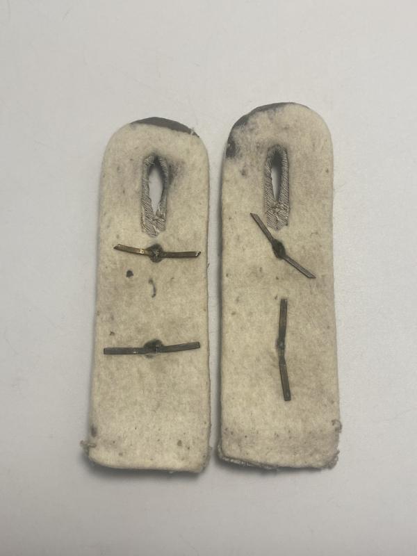 An original matched pair of German Army officer shoulder boards for the rank of Hauptmann (Captain), distinguished by the white Waffenfarbe piping of the Infantry. These are genuine period examples showing honest service wear, making them excellent “been there” pieces with strong character and authenticity.