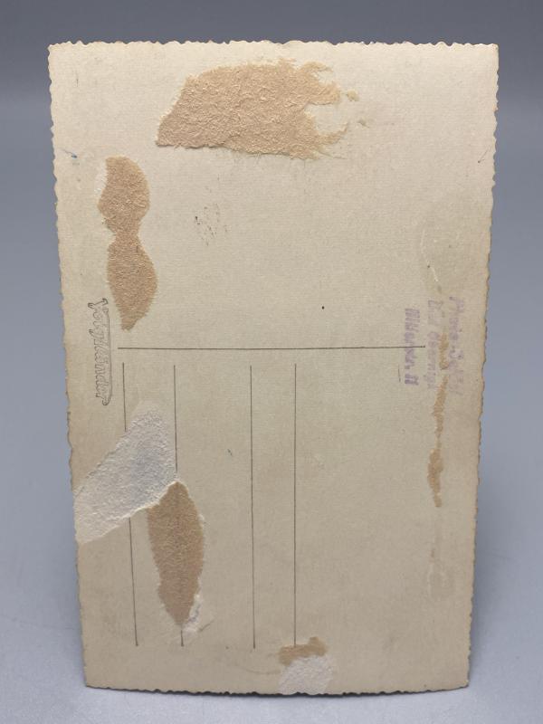 The photograph is printed on postcard stock, typical of wartime studio portraits sent home to family. The reverse retains partial mounting residue and traces of a photographer’s studio stamp, though it is partly obscured.