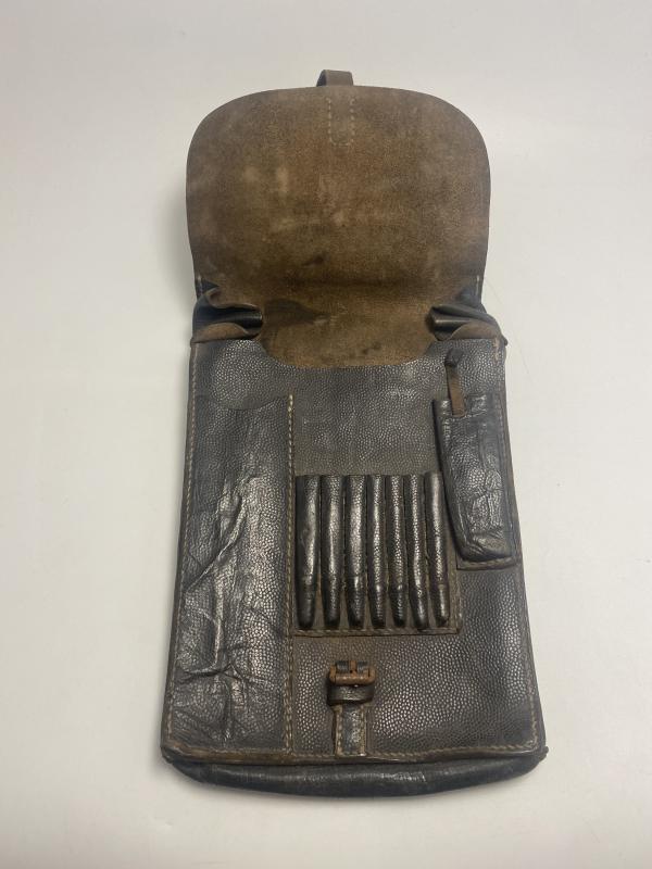 Leather mapcases were a standard piece of German field equipment throughout the Second World War, particularly among command and reconnaissance personnel. Worn on the belt, they allowed quick access to maps during movement and combat. Black leather examples are most commonly associated with early to mid-war issue and were used across multiple branches of service, including the Wehrmacht and Waffen-SS.