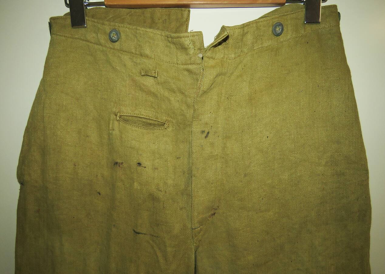 Trousers: Matching material and tone; period construction consistent with the tunic. Minor staining consistent with age and storage history.