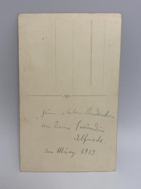 Original postcard-size studio portrait depicting a female member of the Reichsarbeitsdienst (RAD). The photograph shows the subject wearing civilian-style attire with the distinctive RAD neck brooch. The reverse is handwritten and dated March 1939, placing this image firmly in the pre-war period.