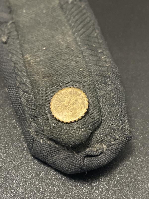 Good condition overall with visible wear and fraying from uniform use, but retaining all original elements including the embroidered emblem and brass button. Thread and cloth remain structurally stable.