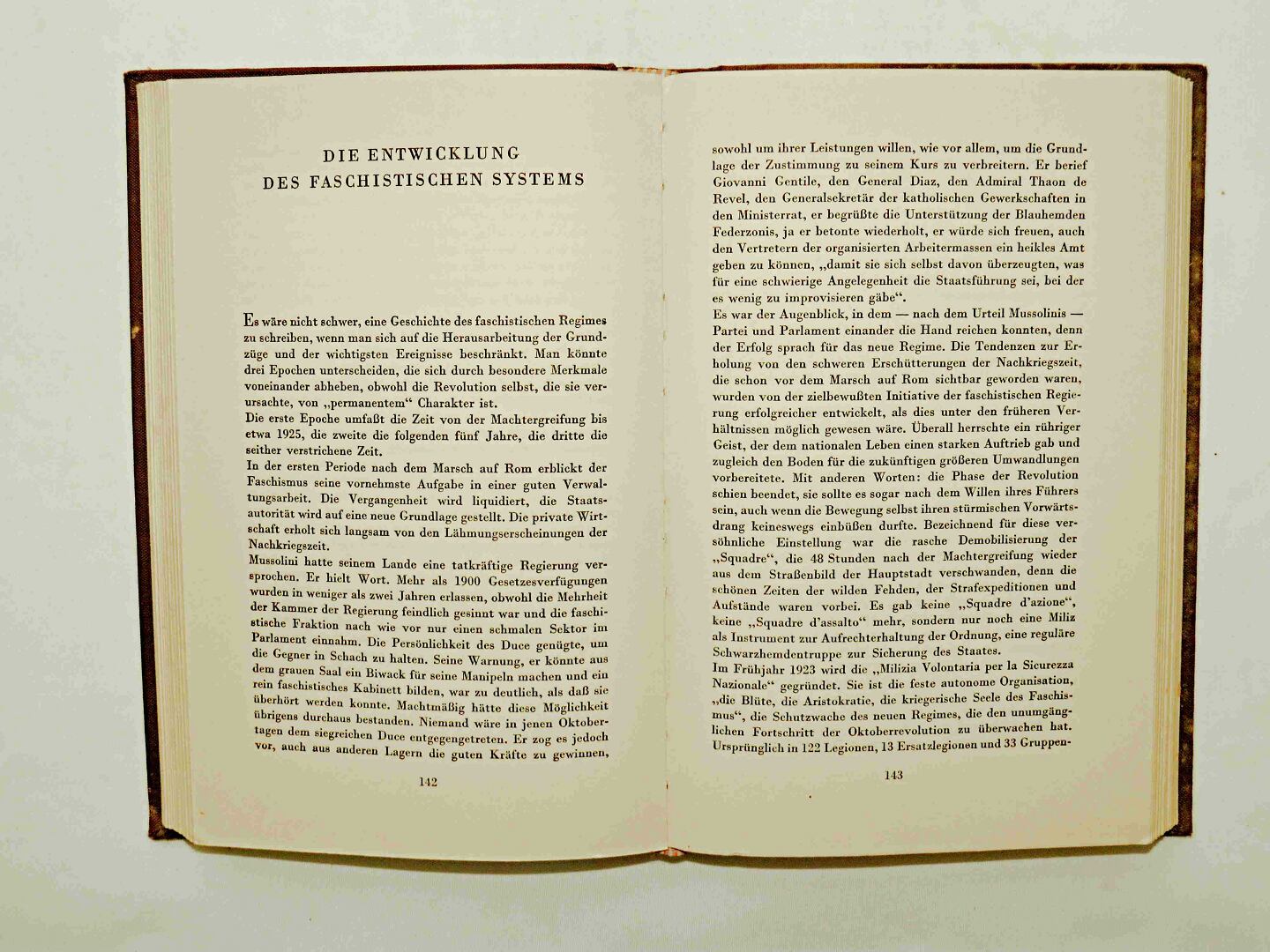 Published in Berlin in 1938, this work emerged during a period of close political alignment between Fascist Italy and National Socialist Germany. The book reflects contemporary German perspectives on Mussolini’s rise, the ideological foundations of Fascism, and the structural development of the Italian state.