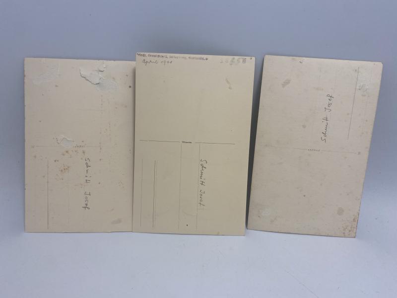 Group of three original WWII-era studio portrait photographs depicting the same German Army soldier, identified on the reverse as Hugo Schmitt. Two of the portraits were taken together on Leonar photographic paper, while the third was taken later following his promotion in April 1941. The set shows the progression of rank and uniform detail across the period and represents a cohesive, named photographic grouping.