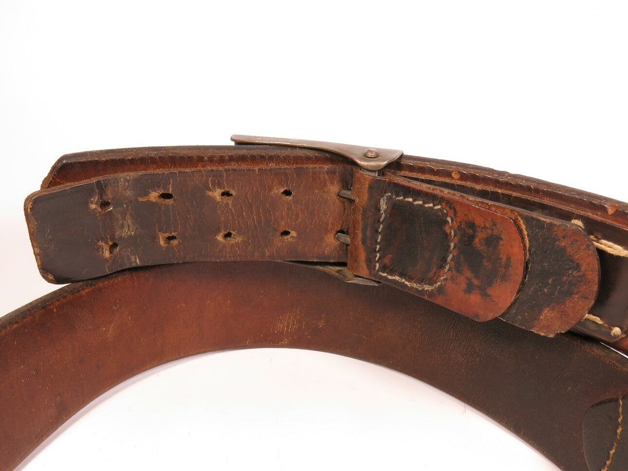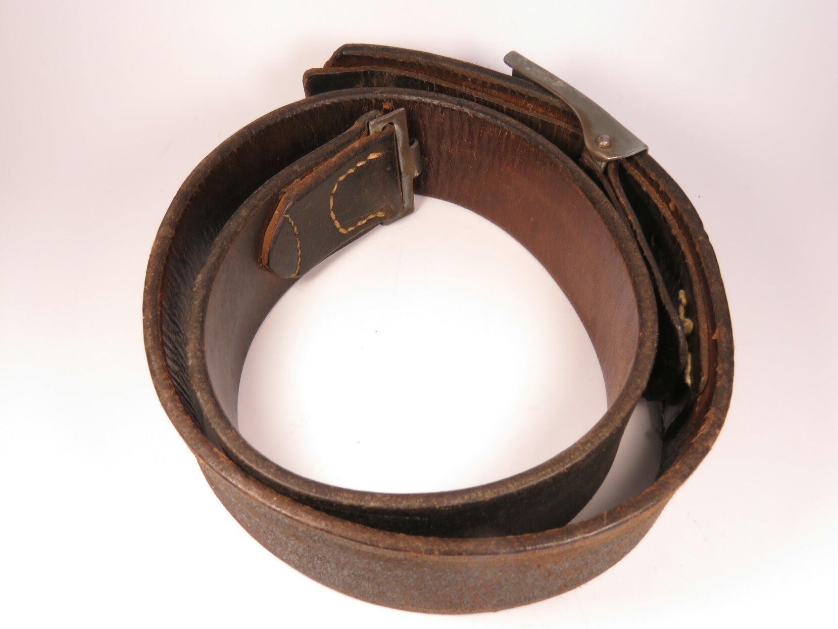 The steel buckle retains clear detail to the crowned device and motto, with even age toning consistent with field use. The leather belt remains supple and structurally sound, showing honest wear, surface patina, and period stitching. Stamped size “100,” shortened to an actual length of approximately 95 cm. No significant structural damage.