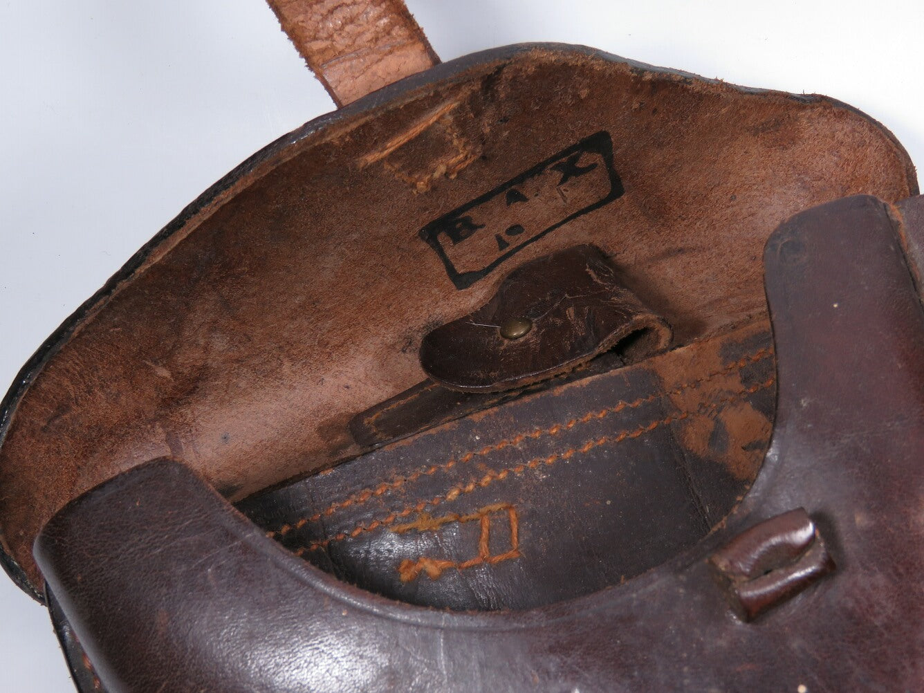 The leather retains a deep, rich dark-brown tone with attractive period patina. Surface wear, minor scuffs and light abrasions are consistent with age and service use. All straps remain present, supple and fully functional, including the closure strap and belt loops. Stitching is intact and strong throughout. The interior flap clearly shows the B.A.X acceptance stamp and partial date. The original Luger disassembly tool is present in its designated inner pocket. Overall, an excellent and complete example for its age.